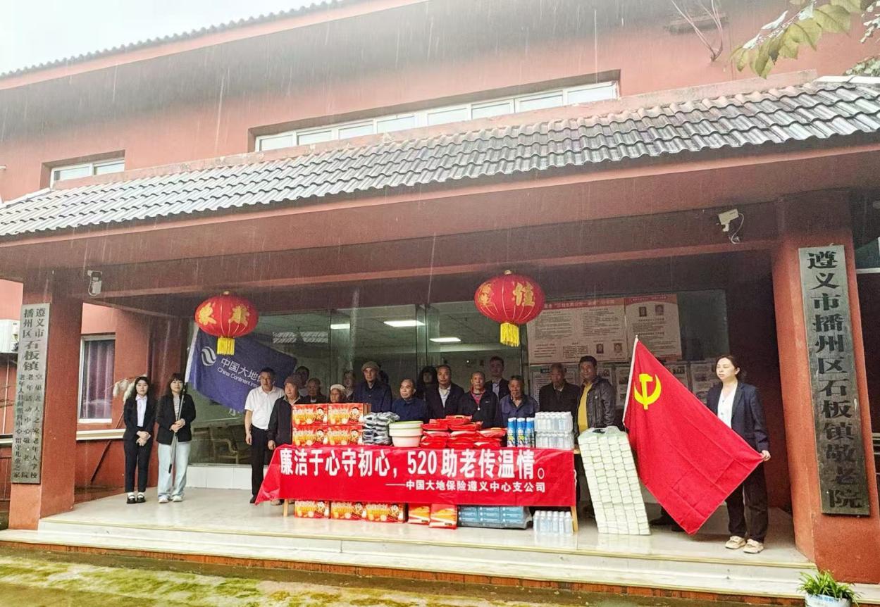 5月27日,中国大地财产保险股份有限公司遵义中心支公司总经理钟建萌率红花岗支公司、播州支公司经理等一行,走进遵义市播州区石板镇敬老院,开展 “大地关爱,无处不在” 暖阳助老助残专项活动。活动将物资捐赠与金融知识普及相结合,既为老年人送去温暖关怀,又切实提升老年群体风险防范意识,彰显企业社会责任与行业担当。