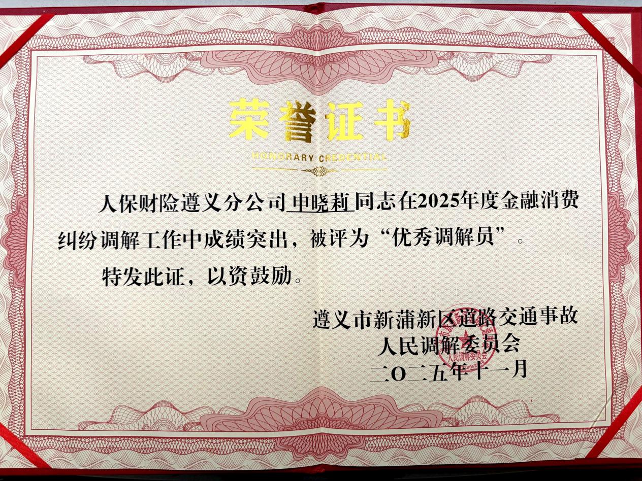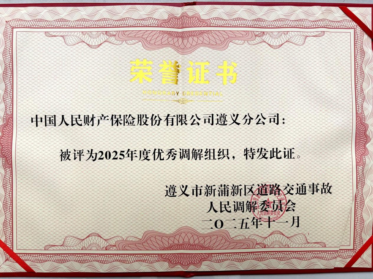 11月13日,人保财险遵义分公司收到由遵义市新蒲新区道路交通事故人民调解委员会颁发的荣誉证书。分公司被评为“2025年度优秀调解组织”,员工申晓莉被评为“优秀调解员”。