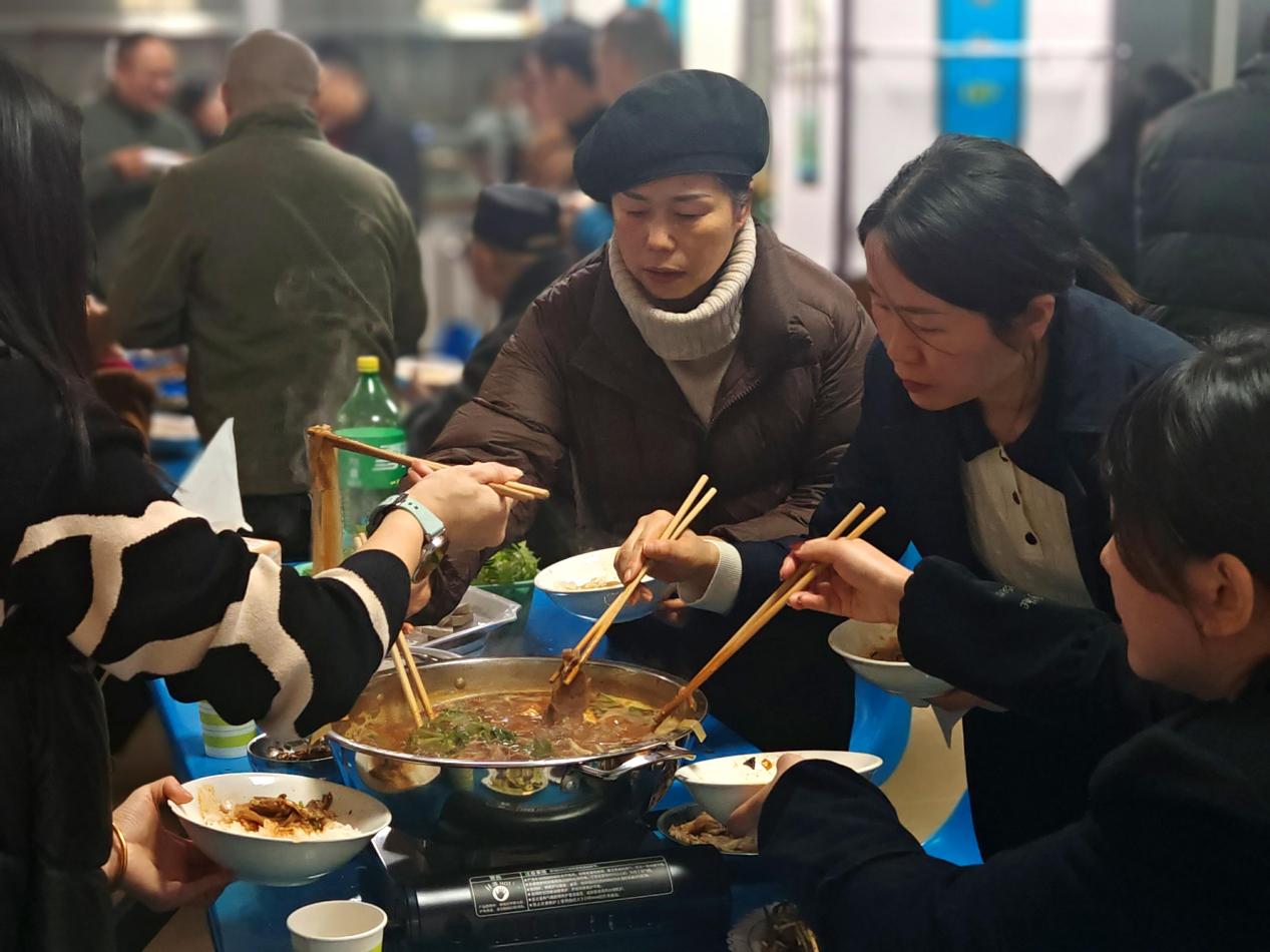 现场暖意融融,餐桌上摆满了极具遵义本地特色的羊肉汤锅与羊肉粉。炖煮得软烂入味的羊肉,汤色奶白醇厚,撒上翠绿的葱花与鲜红的油辣椒,香气四溢;爽滑筋道的米粉搭配鲜香的羊肉臊子,暖胃又暖心。大家围坐一堂,一边品尝着地道的冬至美食,一边畅谈工作与生活,欢声笑语此起彼伏。