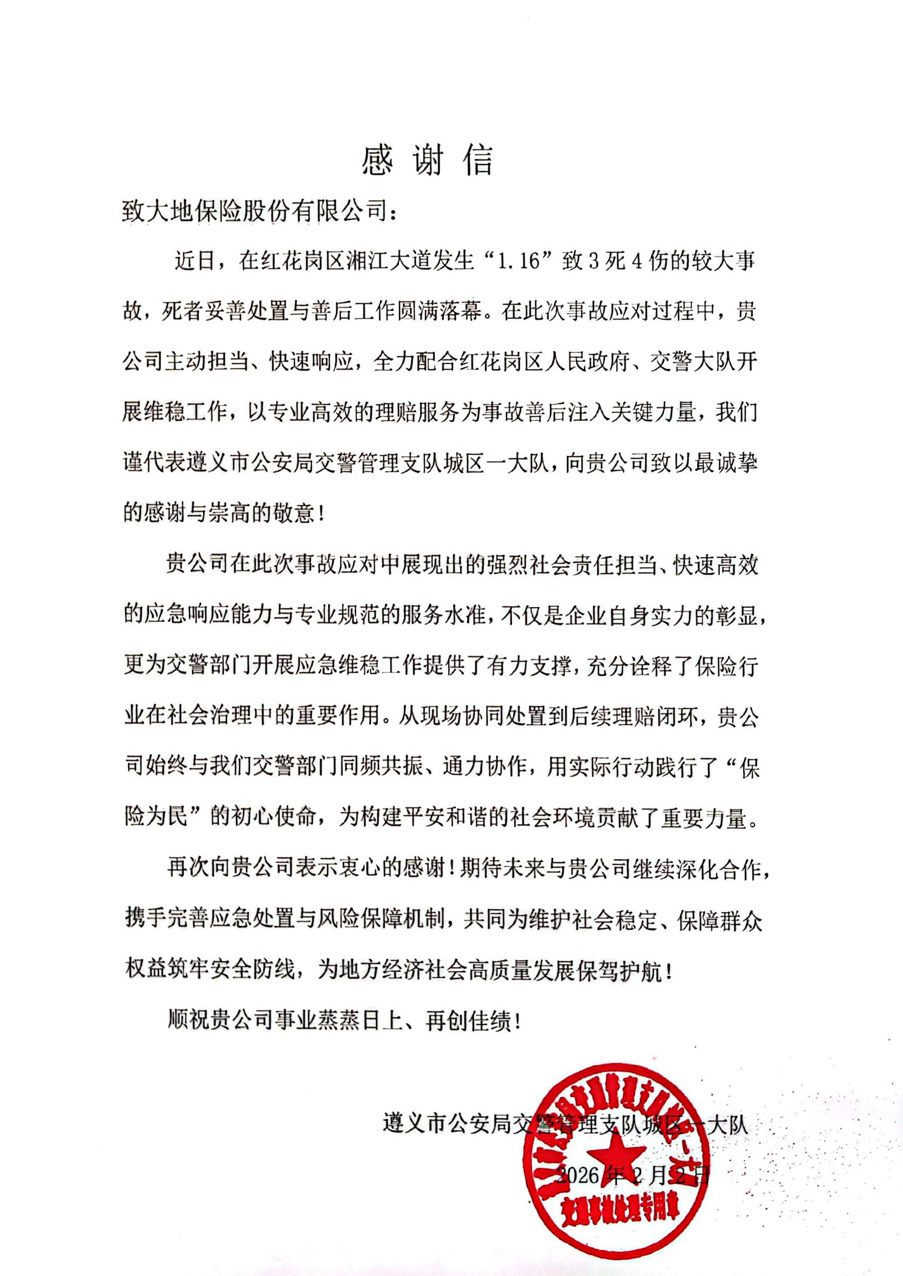 政企协同、高效处置,彰显服务价值。此次事故的顺利处置,不仅展现了遵义中支较好的综合实力与优质服务效能,更是公司“保险为民”核心理念在基层落地生根的生动实践。遵义市公安局交警支队城区一大队在感谢信中,对遵义中支在应急响应、协同处置、理赔服务等方面展现出的专业水准和协作精神,致以诚挚的感谢与崇高的敬意。