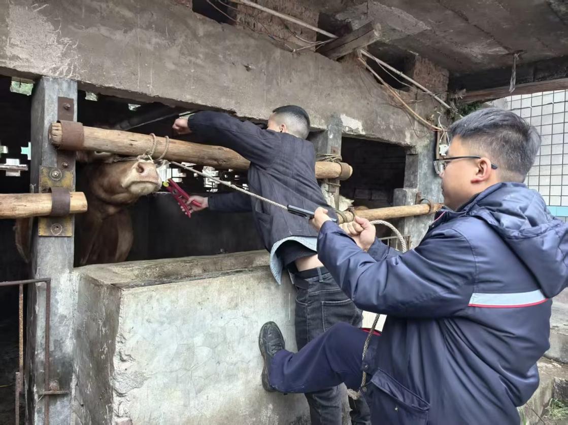 来到遵义市湄潭县黄家坝街道梭米孔村的散户肉牛养殖圈舍,人保财险遵义分公司农险工作人员王光泽娴熟地拿起耳标枪、或牵住牛鼻子,协助当地养殖户为即将投保的肉牛佩戴电子耳标。多年的农险工作经历让他褪去了初入职场的青涩,从职场办公室到乡村的养殖圈舍,他懂得了贴近百姓需要,用乡亲们喜乐见闻的方式开展工作。“今天已经是跑了第三个村头了,走了几十户人家,下队工作嘛,最重要的是要懂得‘入乡随俗’,才能开展好工作。”他颇有经验地说道。入春以来,他和同事奔波于湄潭县的各个乡镇、街道,开展惠农政策宣传,按照“政府引导、政策支持、市场运作、自主自愿、协同推进”的原则,引导农户通过投保地方财政补贴型“黔惠保”牛养殖保险,降低养殖风险,稳定生产预期。